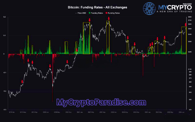 ????The Bitcoin funding rate bearish divergence is a warning sign for the bulls. This means that the Bitcoin price is reaching new highs, while the funding rate is dropping. This indicates that the market is overconfident and overleveraged. Historically, this has led to price declines in the short term.