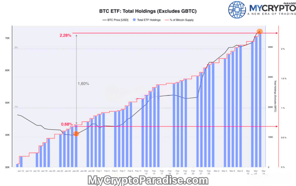 ????We are witnessing ETF funds (excluding GBTC) have acquired a whopping 2.28% of the total Bitcoin supply. But hold onto your hats, because there’s more. A mere 1.6% of Bitcoin’s supply shifting into the hands of traditional finance has sparked an explosive surge. This shift has catapulted BTC’s value from $40K straight to a $70K.