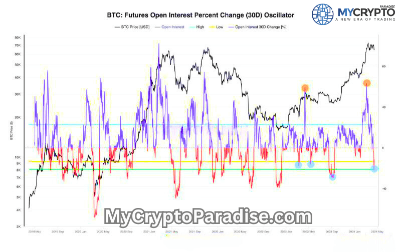 ????For the first time in half a year, the funding rates for the big three have dipped into negative territory. This is a crucial indicator that sentiment among traders is adjusting, potentially gearing up for more substantial moves. Meanwhile, the open interest change oscillator has taken a chill pill, cooling down and cruising past the ???? yellow statistical line after a high at 70K.