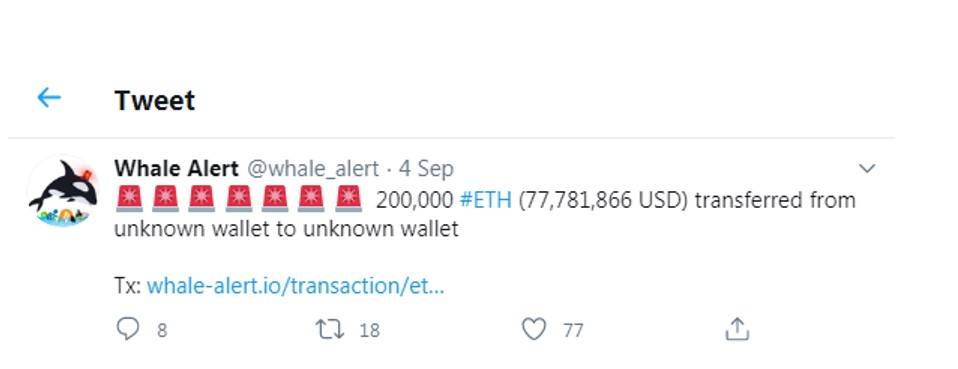 So far, its ledger monitor is tracking four ETH large transactions with the largest being Ether 200,000 an equivalent of $77.7 million between unknown wallets, with none appearing to have landed into to a crypto exchange where it could potentially be exchanged into fiat.