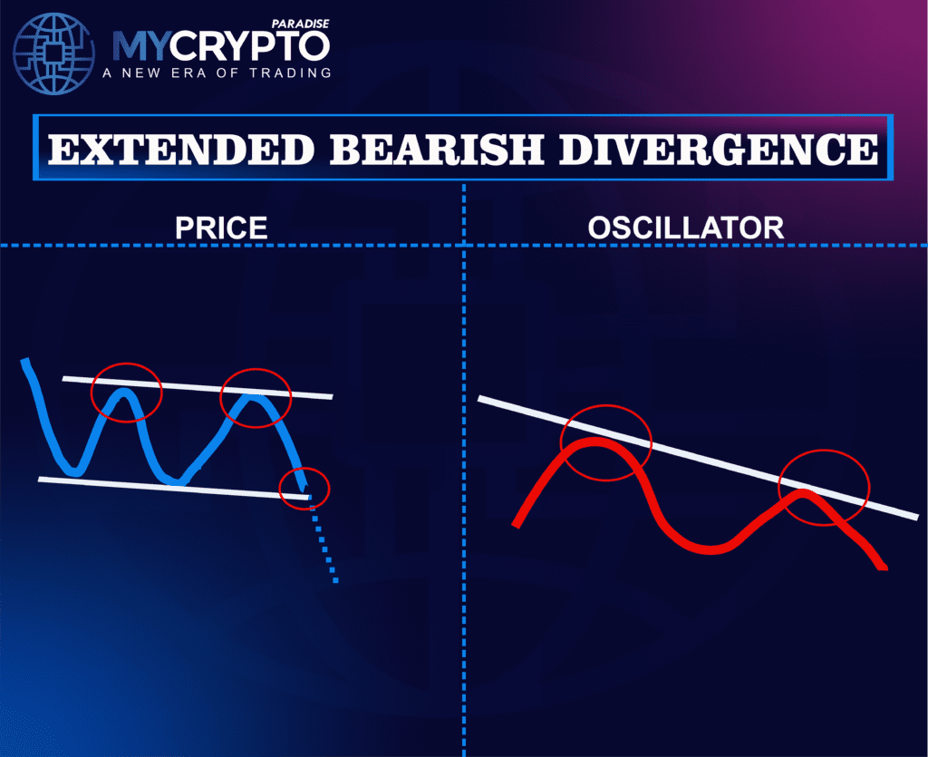 Extended bearish divergence is a more subtle yet important signal in the crypto trading world. It occurs when the price makes a significantly higher high, but the oscillator (like RSI, MACD, or Stochastic) forms only a slightly higher high or even remains flat.