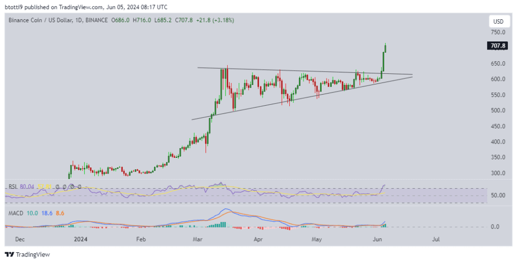On the technical charts, BNB’s breakout from an ascending triangle has pushed the RSI into the overbought territory. However, it’s not excessively extended, and the MACD supports a continued bullish outlook, indicating sustained buying pressure.