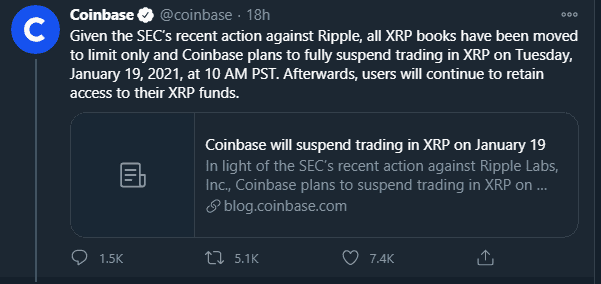 Coinbase, a major crypto exchange, has announced its holdup from XRP trading following the lawsuit filed by US Security Exchanges Commission (SEC) upon Ripple.