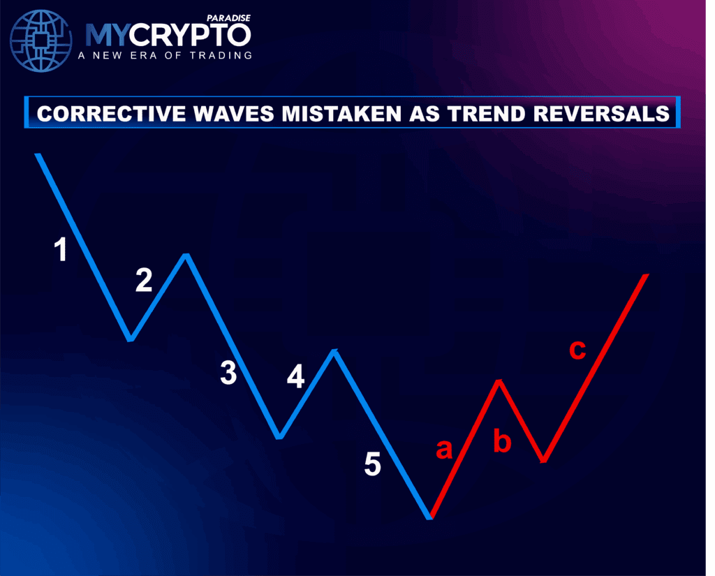 A classic mistake is interpreting a correction (like an ABC zigzag) as a complete trend reversal. Corrective waves tend to be sharp and deep, often tricking traders into thinking a new trend has begun. This leads to poor entries and premature exits.