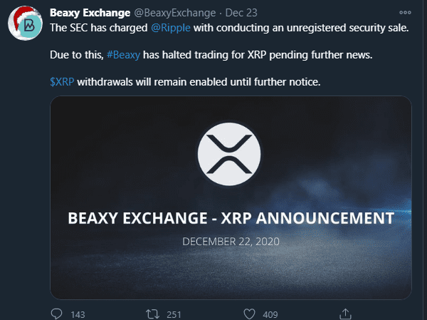 Beaxy Exchange, a Chicago-based exchange, has also called it quits with the XRP currency. The company has gone off to claim that Ripple might have been conducting unregistered security sales, and they choose to withdraw until further notice.