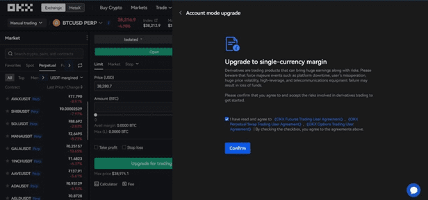 As a beginner to margin trading, you should understand and acknowledge the risks involved, therefore, OKX would allow you to trade only after checking the box and clicking “Confirm” as shown in the screenshot below. You should get a response that your account has been activated successfully.