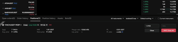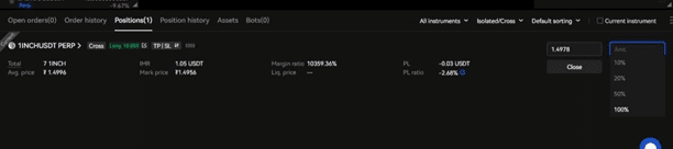 To do this, set the amount you want to trade with (you can use all or part of your trading funds). For this guide, we initiated a Long position under “perpetual” at market price because we thought 1INCH would rise. If we were convinced 1INCHUSDT was going to drop, it would have been a Short trade.
