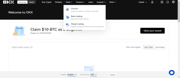 On the OKX homepage, go to the top menu and click on “Trade”. From the drop-down menu, select “Margin trading“. If you’re a beginner, it is highly recommended to use the basic view. However, the Advanced option might be suitable for an experienced trader for a more comprehensive view.