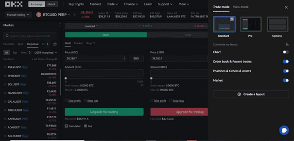 You can easily switch from advanced to basic view by simply clicking on the layout option (just before the gear icon at the top-right corner), then, clicking on “Standard” and deactivating the “chart’. Moreover, the OKX platform allows you to customize the layout to your taste.