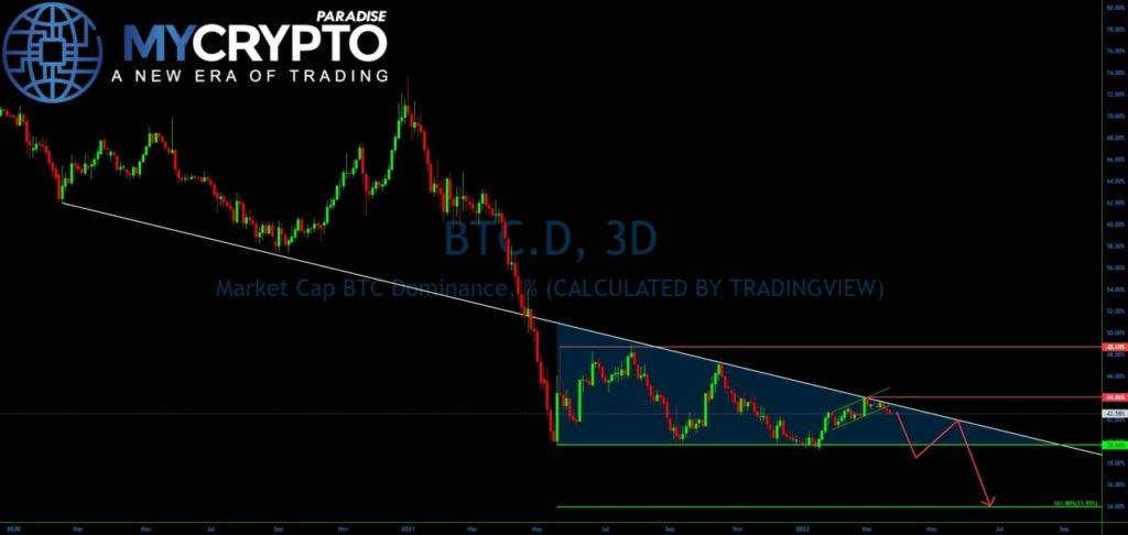 ????Such price action certainly increases the probability of further downtrend, which in the end, can drop the Bitcoin Dominance as low as 34%.