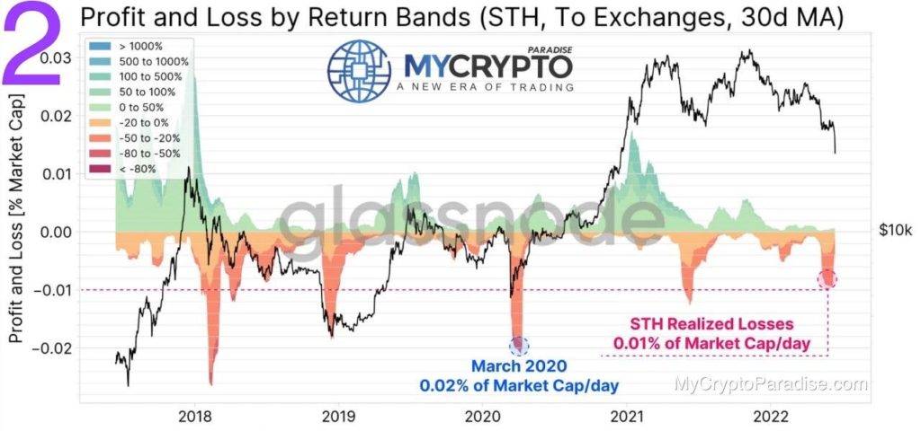 ????In the second picture, we can inspect the coins sent directly to exchanges by Bitcoin Short-Term Holders (STH). Here we can see that they have realized losses of 0.01% of the Market Cap per day so far. Whilst significant, these STH losses are not as large as major sell-offs in the last 5 years.