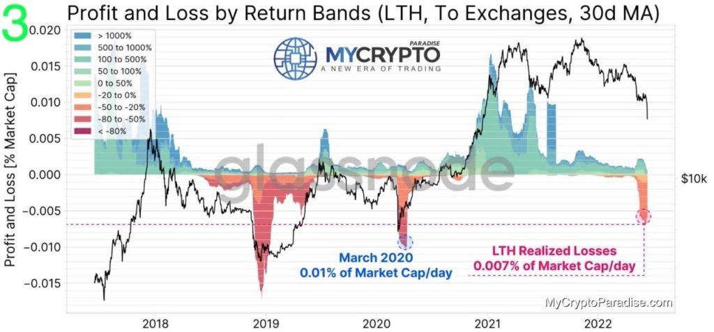 ????In the third picture, you can see that the Bitcoin Long-Term Holders (LTH), however, realized major losses, equaling 0.007% of the Market Cap per day!!! This is almost as large as March 2020 and is the first major LTH silent capitulation event in the 2021-22 cycle, silent – because nobody is talking about it.
