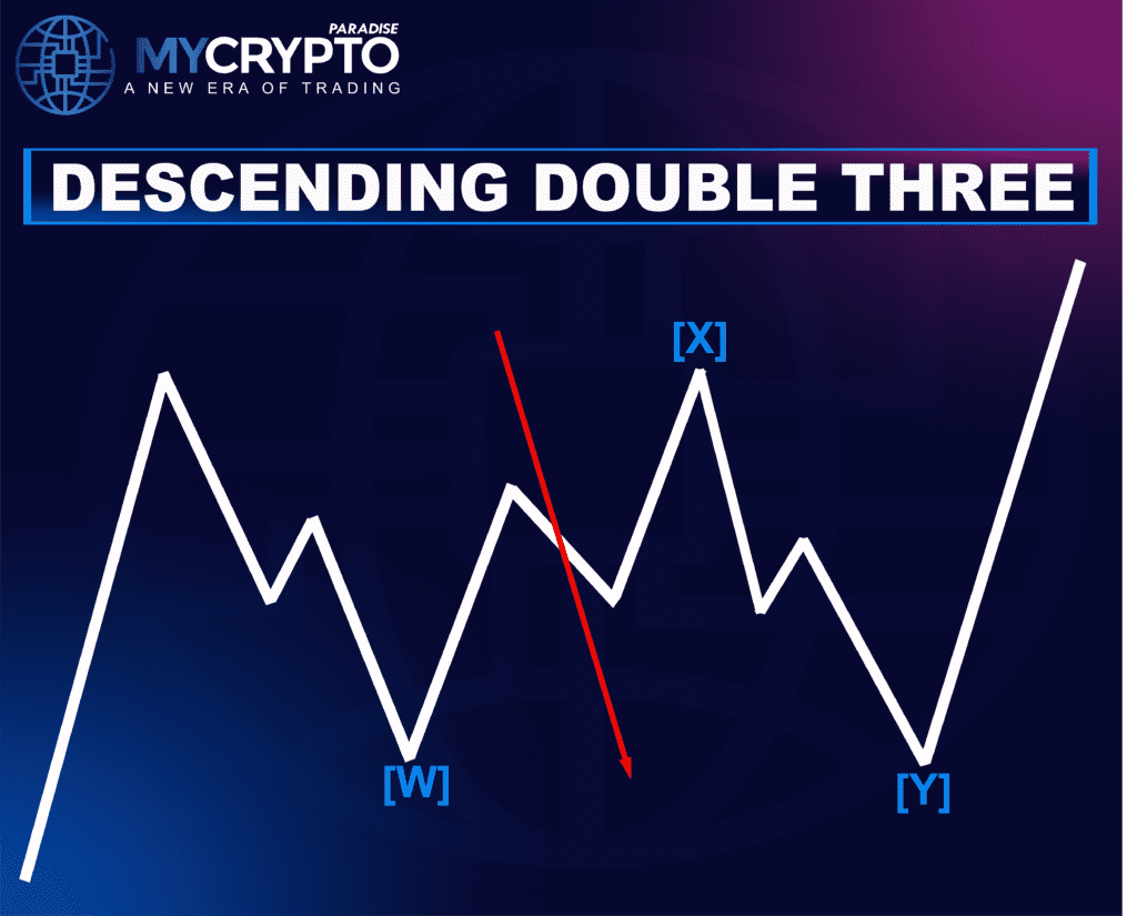 The structure of a descending Double Three remains the same, W-X-Y, but its direction is tilted against the prevailing uptrend. This gives it a downward appearance without signaling a trend reversal.