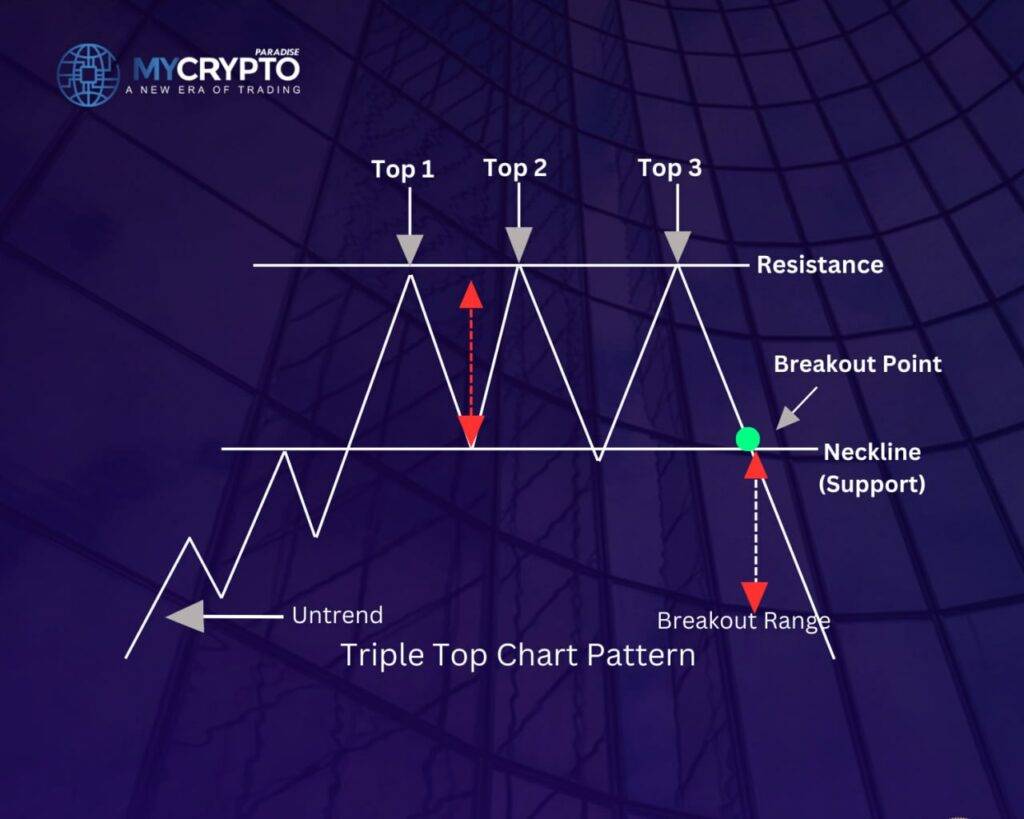 Experienced crypto traders make the triple top an important technical tool for easy profitable trading. The probability of a price decline or trend reversal after a triple top is quite clear. It is a chart pattern that consists of three peaks at approximately the same level, representing the price of an asset reaching a resistance level three times but failing to break through it.