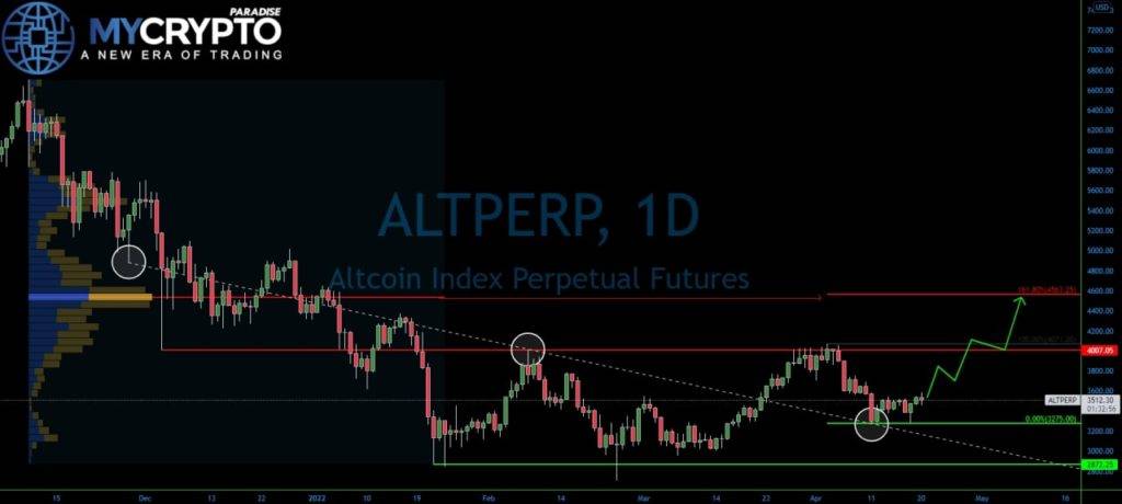 ????The critical factor in the recent price action of the Alt Index is the bounce off the average-price downtrend trendline. Besides, after a bounce, we can see a double bottom formation near 3275.