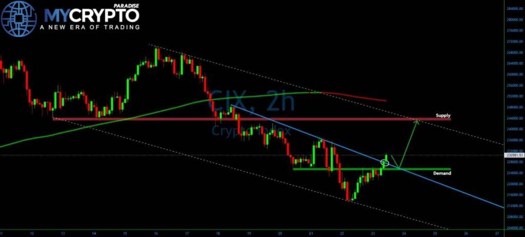 ????The Crypto Index is starting to look bullish as higher lows and higher highs pattern is already in place on lower timeframes. At the same time, we can see the break above the 225,500 resistance area, which has now become the demand zone.