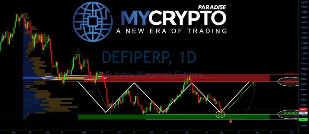 ????The critical support lies at 5590, which is confirmed by the 88.6% Fibonacci retracement level. As of yet, Defi respected the support while trading at the bottom of the 5590 – 8770 range. This might be the beginning of a new cycle, based on the previous market waves.