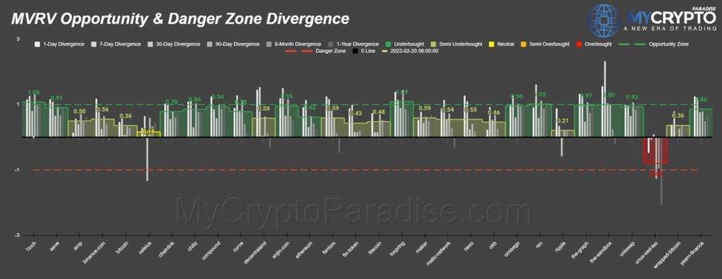 ????Based on our MVRV divergence graph, we can clearly see that several altcoins have reached the historical best long-term investment opportunity zone after a multiweek downward pressure.