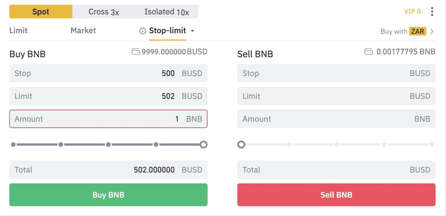 Let’s assume that you want to place a sell stop-limit order on BNB/BUSD. You create a Binance account or login into their website. Then, navigate to the market section and open the market space for the trading pair BNB/BUSD. After that, you select the stop-limit tab and input your prices. To effectively use the sell stop limit, the limit order price has to be a little lower than the stop trigger because when the market price gets to the stop trigger it opens your limit order.