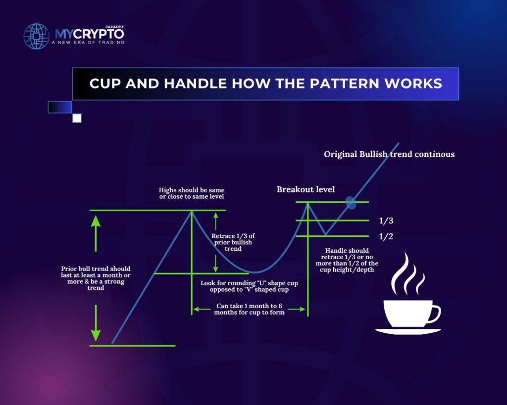 1. The Cup: The cup portion of the pattern resembles a rounded bottom or a shallow U-shape. It is formed when the price of an asset gradually declines, reaches a bottom, and then starts to move upward again. The duration of the cup formation can vary, ranging from a few weeks to several months.