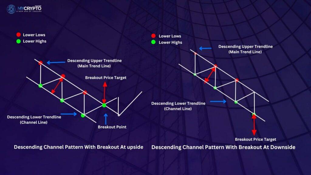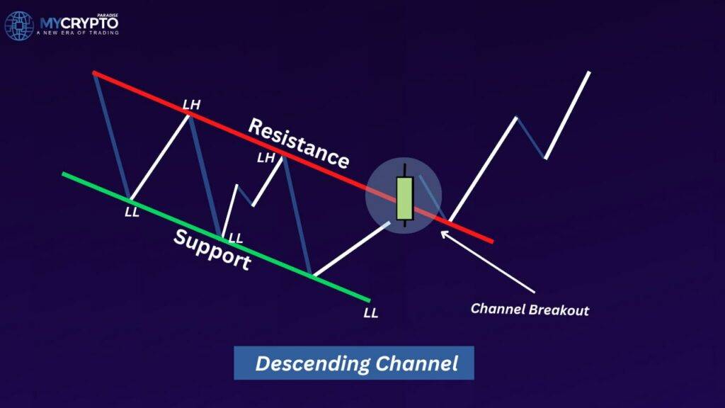 In a bearish crypto market, traders must be able to adapt to changing market conditions. The descending channel is a technical analysis pattern that can be used to identify opportunities to sell short. Also to profit from the decline of a crypto asset price. Traders can identify a descending channel by looking for a downtrend in the price of the asset and drawing two parallel lines to form the channel.