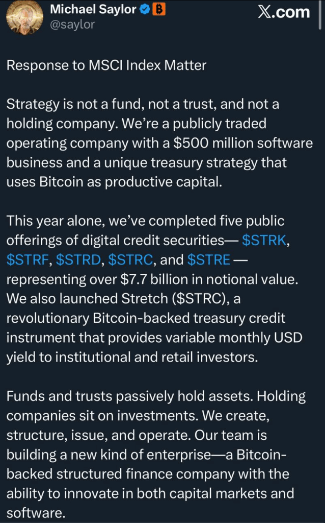 Yello Paradisers! It started with a sudden plunge. MicroStrategy’s stock fell fast, dragging Bitcoin along with it. Traders were puzzled until a Crypto Banter episode suggested that MSCI might remove crypto treasury-heavy companies like MicroStrategy from its indexes in 2026. The rumor spread quickly and chaos followed.