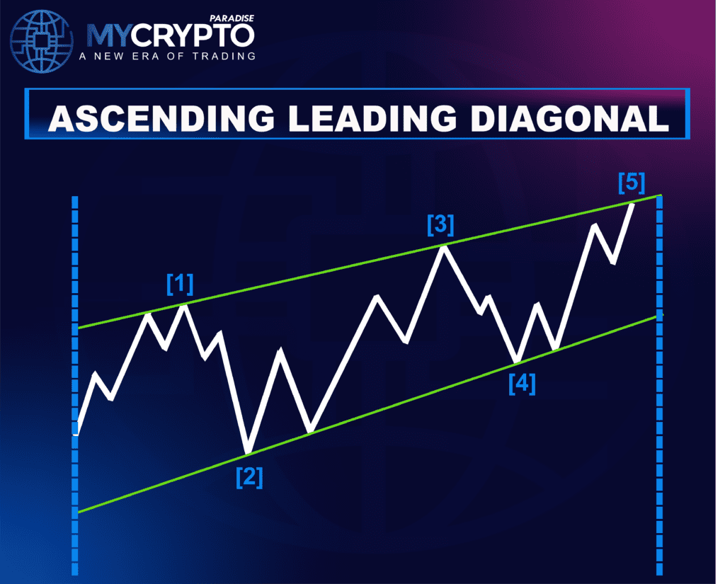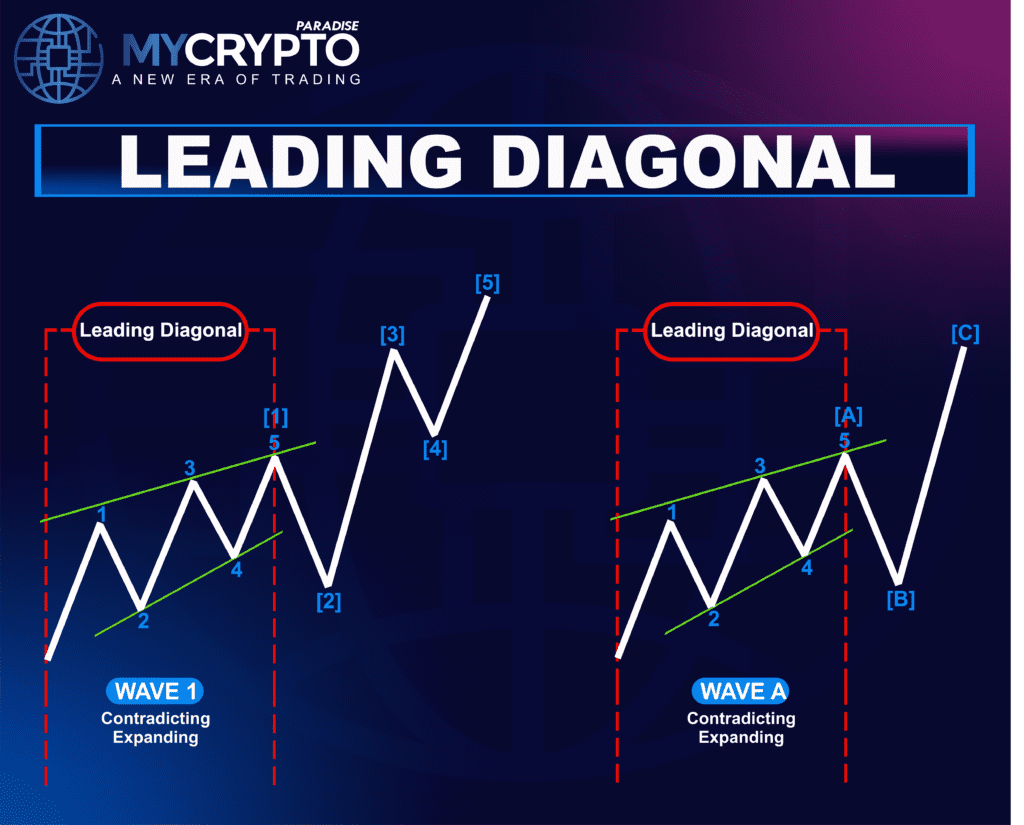 A leading diagonal is more than just a structural pattern in Elliott Wave Theory as it often signals the early stages of a strong price movement. Unlike a standard impulse wave, a leading diagonal shows a gradual yet determined push in the market’s direction, often accompanied by choppy or overlapping price action. This formation suggests that although the crypto market may appear hesitant at first, a more forceful trend is about to develop.