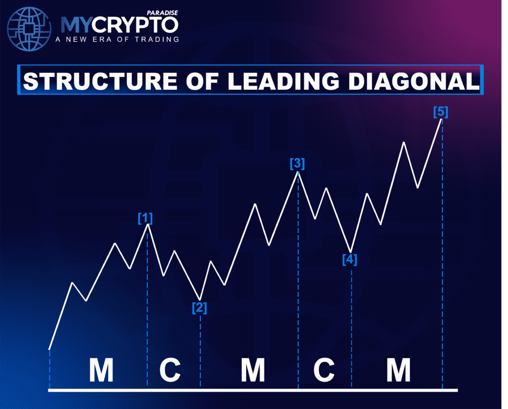 - Unlike a standard impulse, waves within a Leading Diagonal overlap, forming a wedge-like structure that can be ascending (bullish) or descending (bearish).