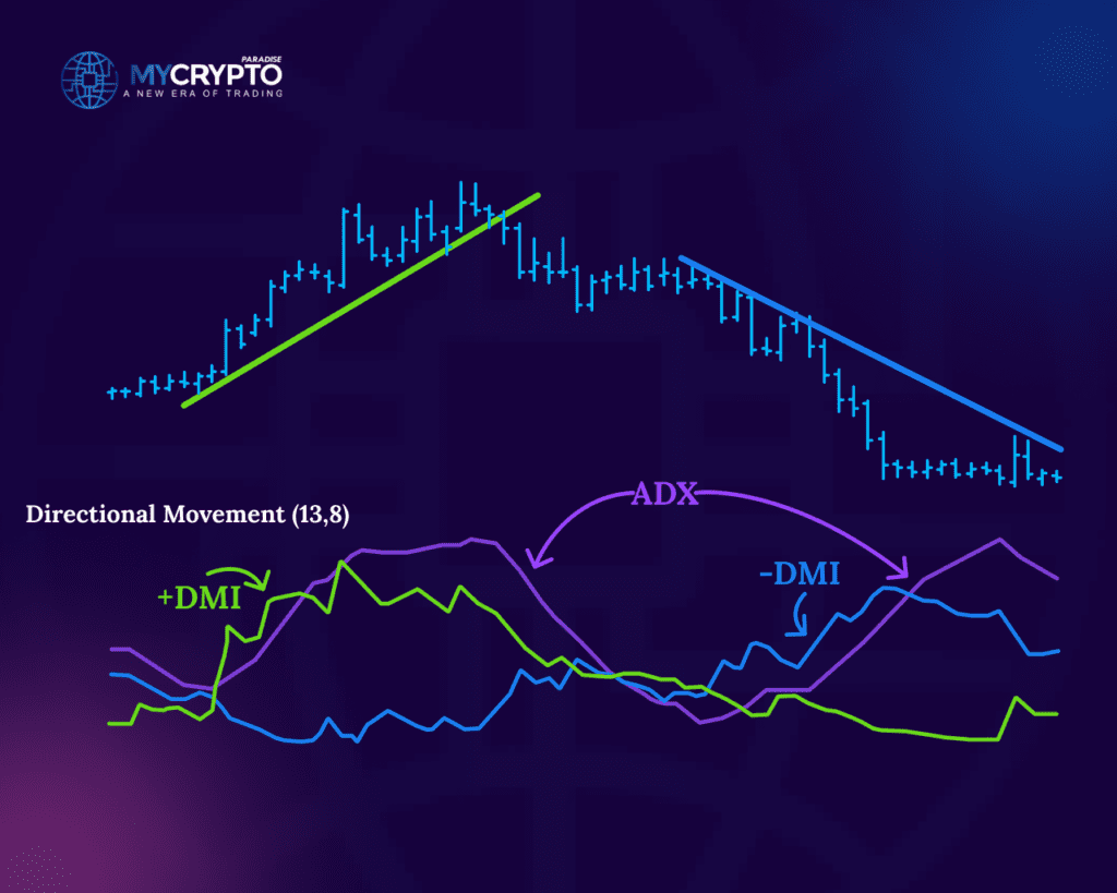 The ADX is a trend-strength indicator that measures the strength of a prevailing trend. It ranges from 0 to 100, with higher values indicating a stronger trend. Traders use the ADX to determine if a cryptocurrency is trending and to assess the strength of the trend. A rising ADX suggests a strengthening trend, while a falling ADX indicates a weakening trend or a potential trend reversal.