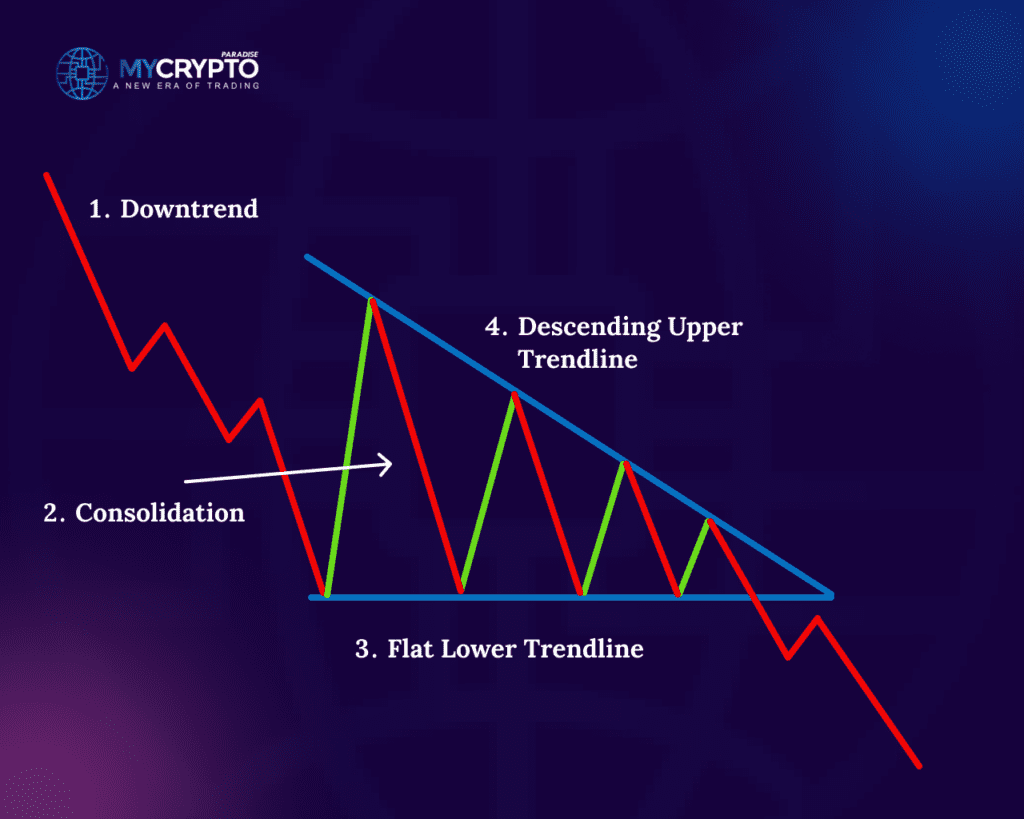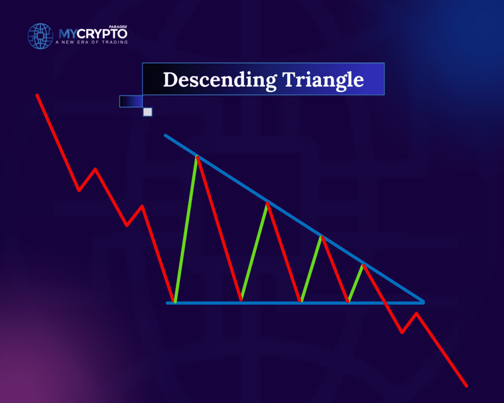 The bearish descending triangle pattern is formed when sellers dominate the market, leading to lower highs and a relatively stable support level. As the price reaches the support level multiple times, it creates a horizontal trendline.