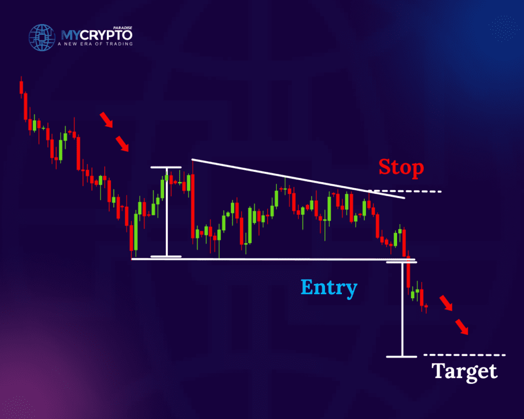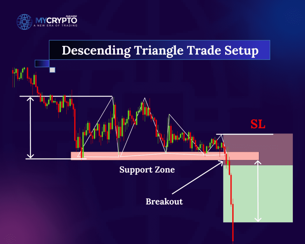 – Breakout Entry: One common approach is to enter a short position on a confirmed breakdown below the support level of the descending triangle pattern. This breakdown should ideally be accompanied by increased volume, indicating strong selling pressure.