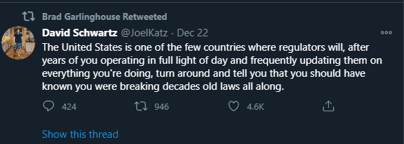 As Brad proclaims, Ripple’s lawsuit might be the stumbling block that causes a snowball effect for other market makers. Maybe it is a move by Trump’s administration to jam up Biden’s reign?