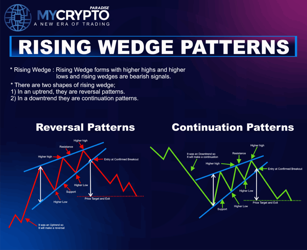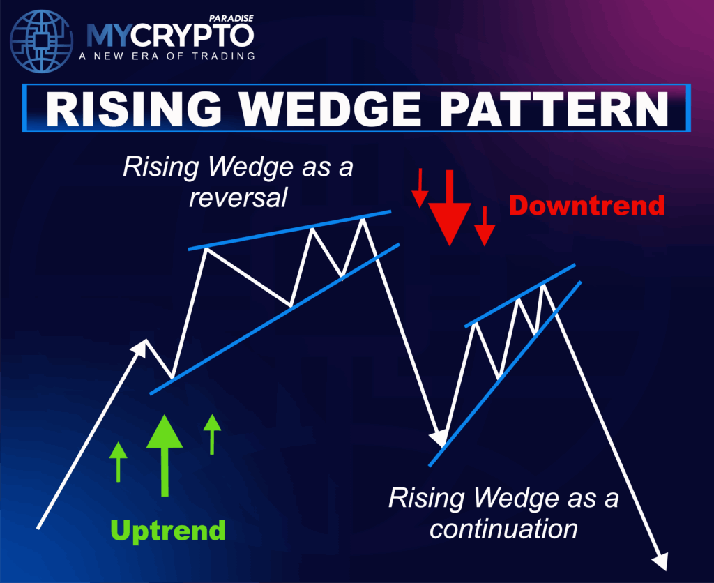 - The Rising Wedge Pattern is a bearish chart formation that signals a potential trend reversal or continuation within a downtrend in crypto markets.