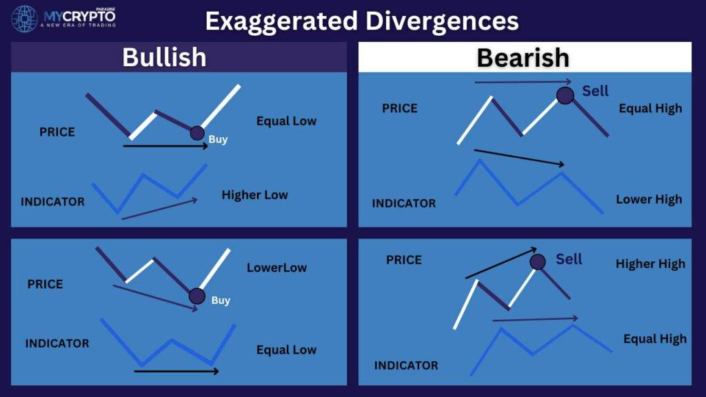 There are two main types of exaggerated divergences that can occur in crypto markets: bullish exaggerated divergences and bearish exaggerated divergences.