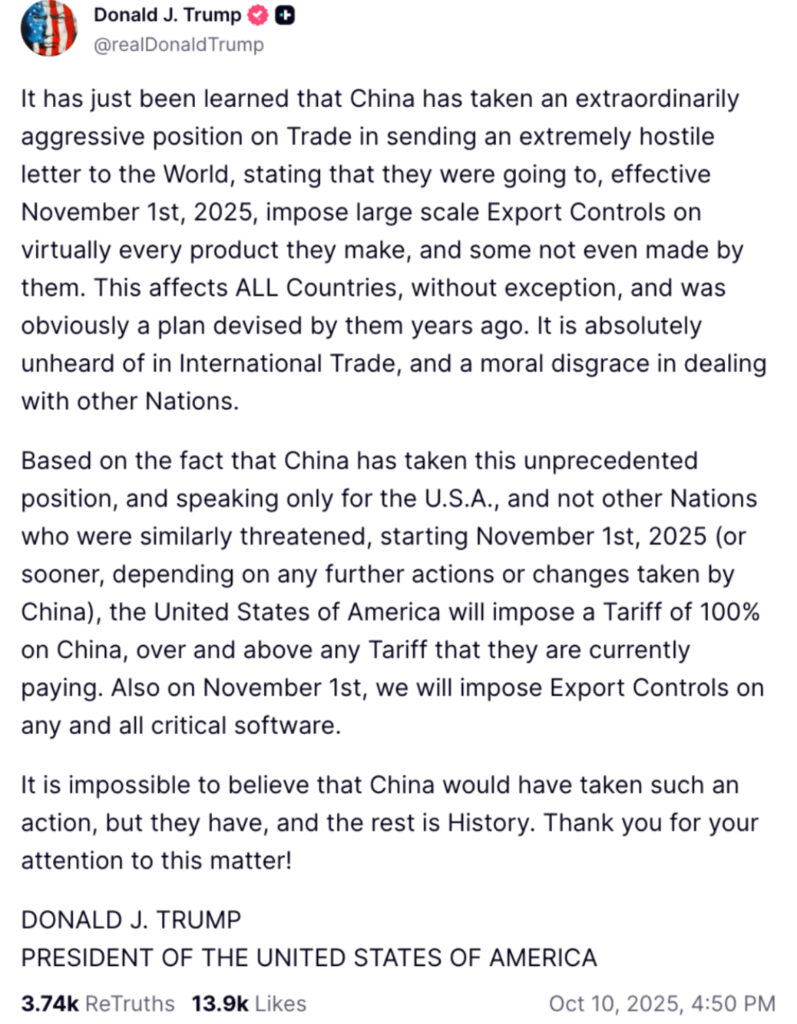 • Trump threatens a “massive tariff hike” after China restricts rare earth exports, putting the APEC meeting with Xi in jeopardy.