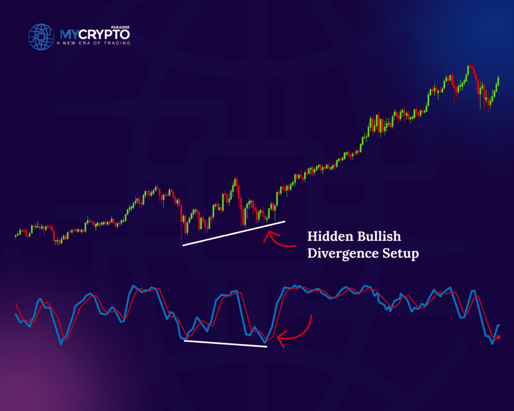To identify this divergence, traders typically use oscillators such as the Relative Strength Index (RSI), Moving Average Convergence Divergence (MACD), or Stochastic Oscillator. These indicators help measure the momentum and strength of a price trend. When looking for bullish hidden divergence, crypto traders should focus on the lows of both the price and the indicator.
