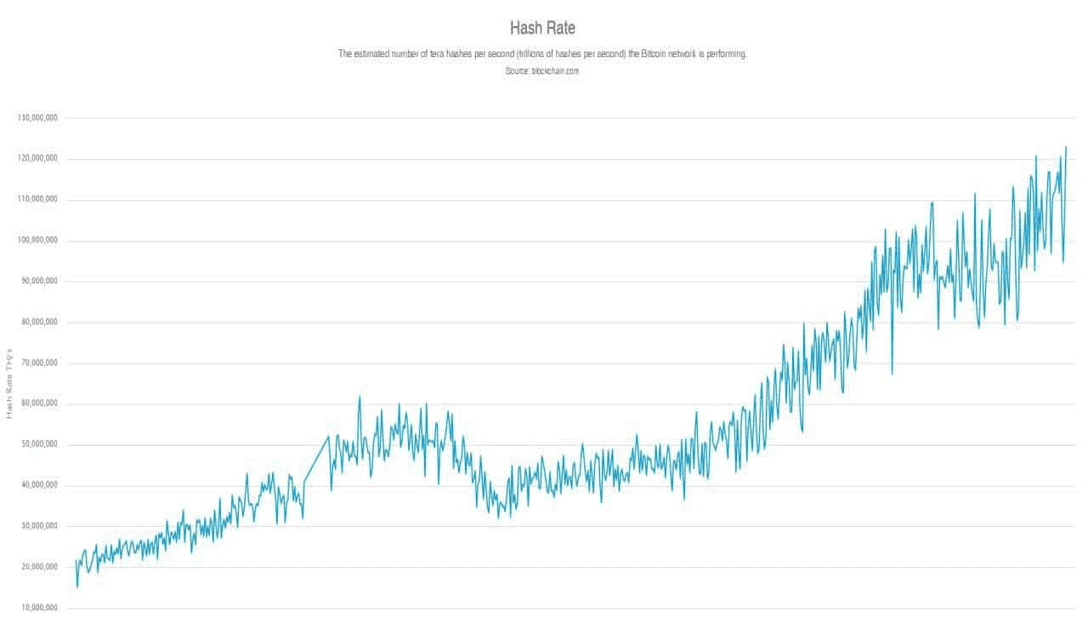 The graph above shows the number of tera hashes per second the Bitcoin network is performing.