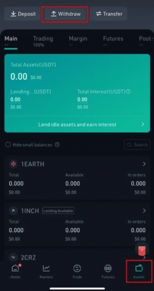 Simply open the KuCoin app on your phone, log in to your account, and click on ‘Assets’ at the bottom right corner. Then, click on ‘Withdraw’ at the top. This will open the withdrawal page.