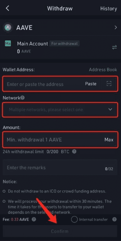 On the withdrawal page, choose the crypto you want to withdraw. Then, input the required information such as recipient crypto wallet address, corresponding network, and amount to be withdrawn. Then click on ‘Confirm’. A confirmation page pops up, read through then confirm.