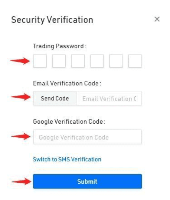 Next, is the security page, where you have to input your trading password, email verification code and Google 2FA. Then, click on ‘Submit’.
